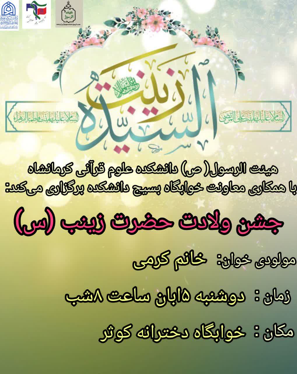 و همینطور برگزاری جشن ولادت حضرت زینب سلام الله علیها با عنوان اجتماع دختران زینبی به همت هیات دانشجویی دانشگاه های استان ‌کرمانشاه در محل سالن اجتماعات دانشکده علوم قرآنی کرمانشاه، با دعوت از دانشجویان دختر سایر دانشگاههای شهر کرمانشاه و با حضور افتخاری "حاج‌آقا ایزدخواه" از شهر مقدس مشهد همراه با برنامه های شاد و مفرح برگزار شد.