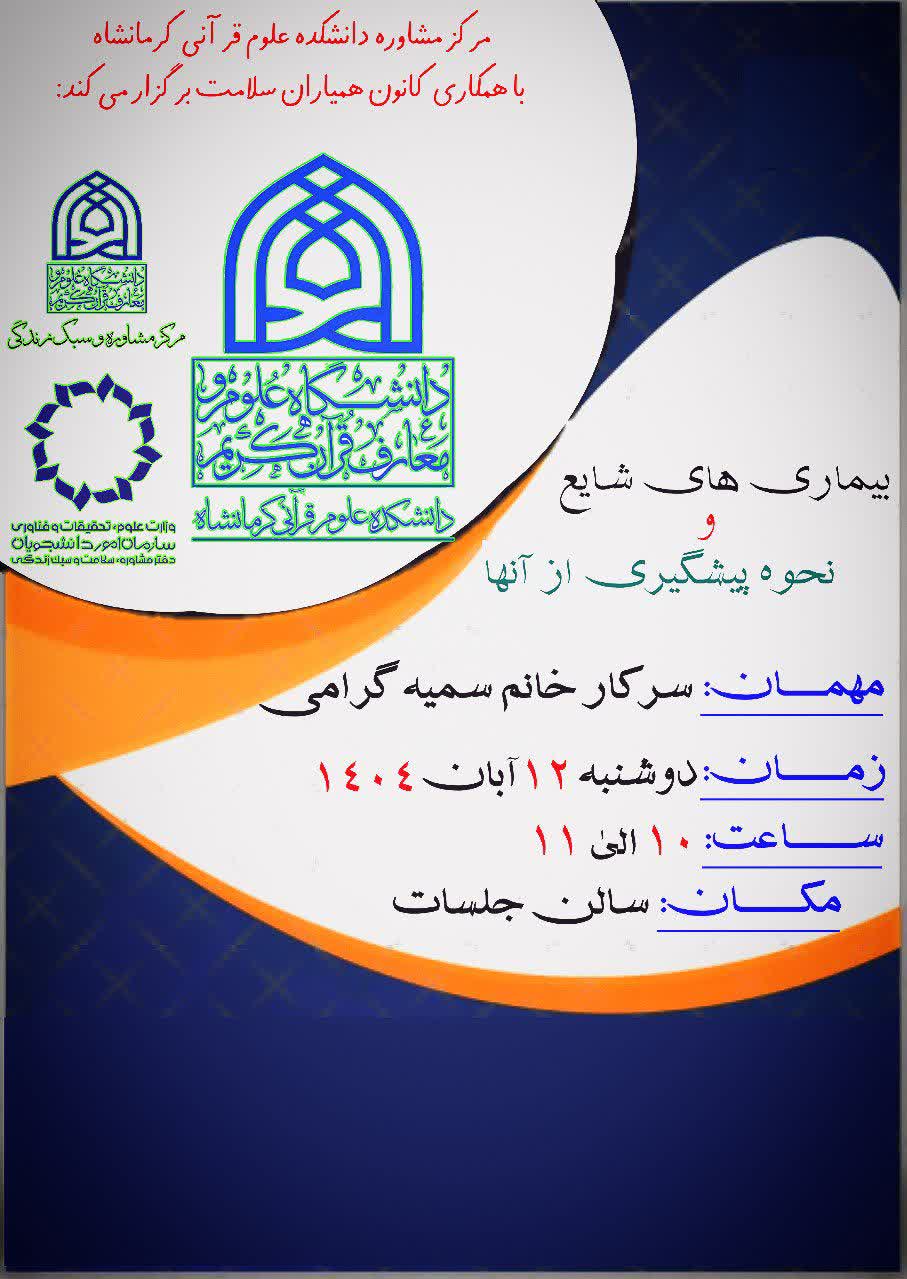 کارگاه آموزشی پیشگیری از بیماریهای شایع و نحوه پیشگیری از آنها در محل سالن جلسات دانشکده علوم قرآنی کرمانشاه تشکیل گردید .
